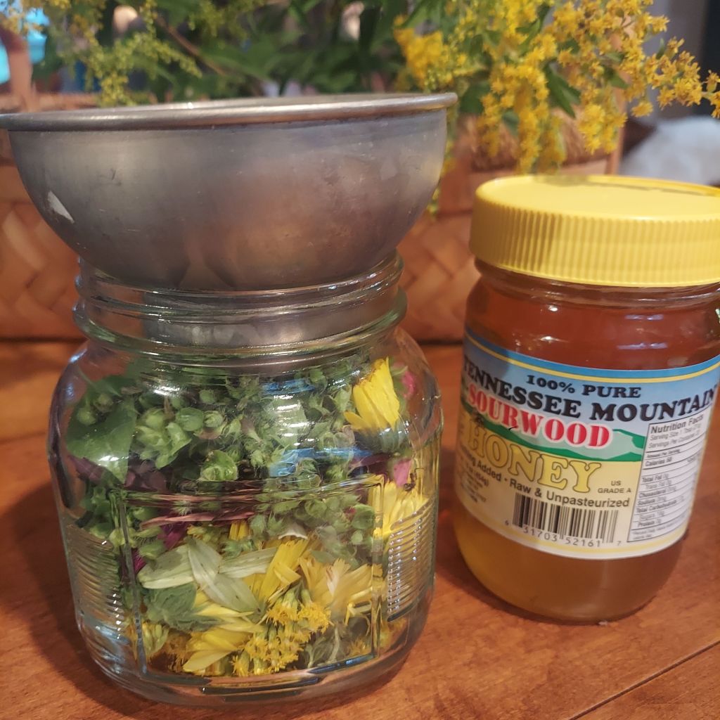 1. In a clean glass jar, layer your fresh flowers loosely—goldenrod sunshine, calendula’s orange glow, coneflower’s purple stars, and holy basil’s green-and-purple perfume.
